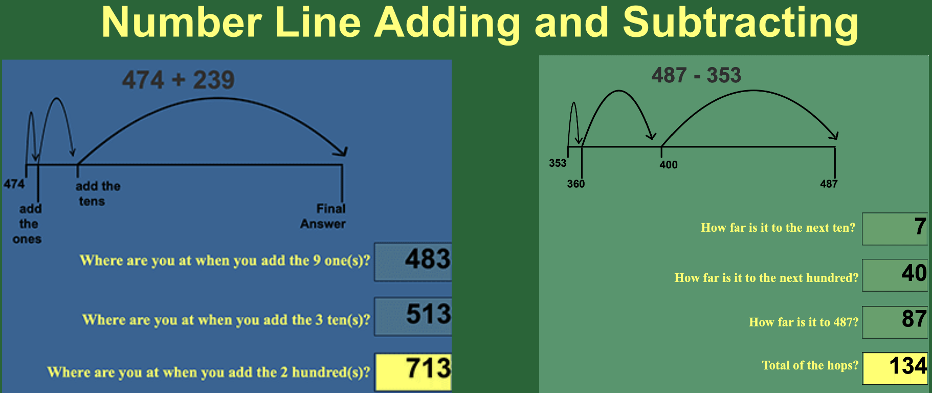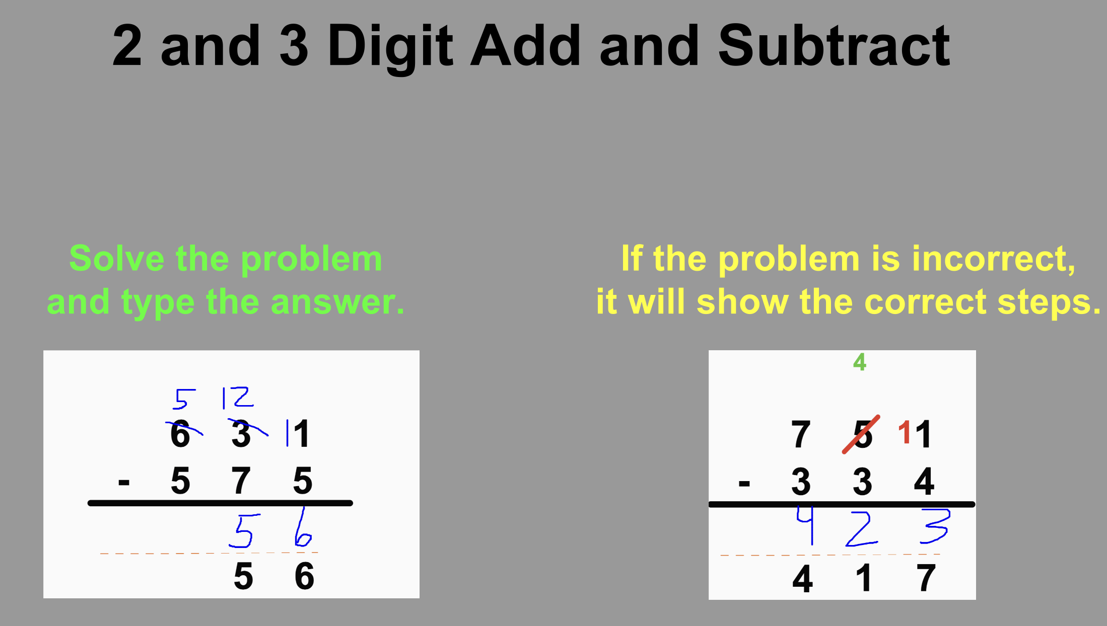 2 and 3 digit add and subtract with animations that show the steps.