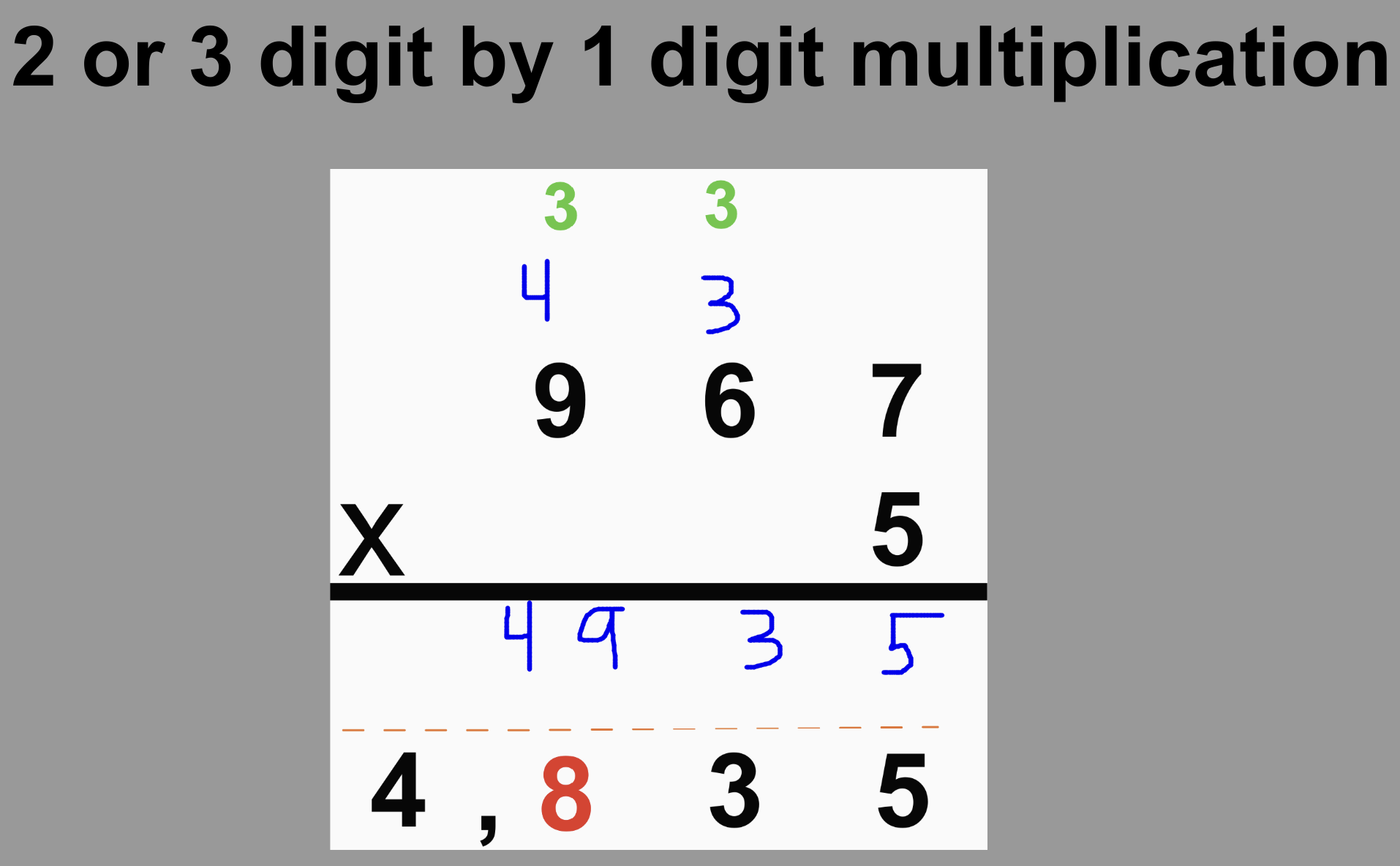 2 and 3 digit by 1 digit multiplication with animations that show the steps.