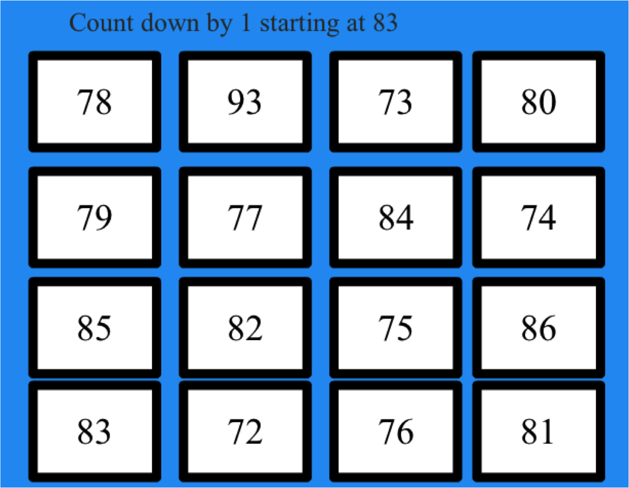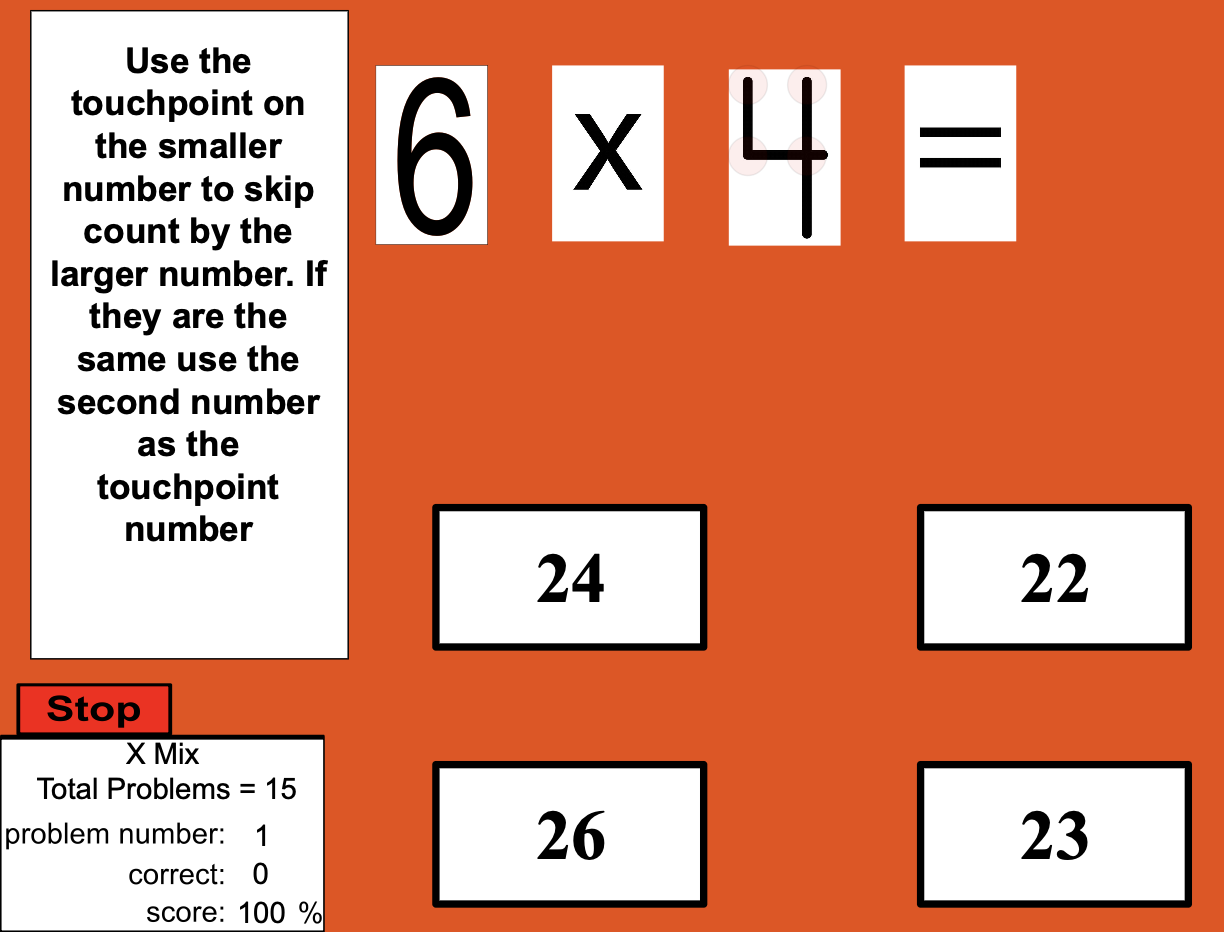 In this program students are given a starting number and then a number to count by. Students have to count up and down by 1, 5, and 10's.